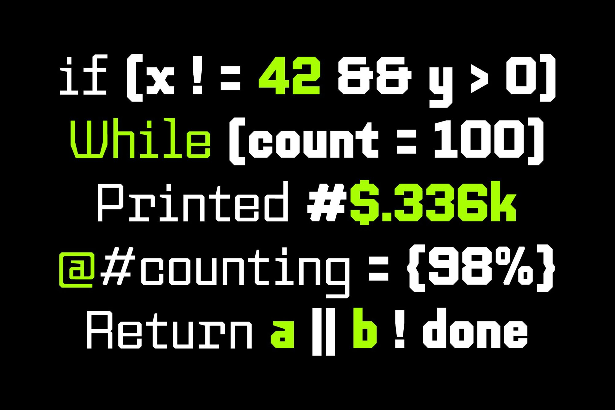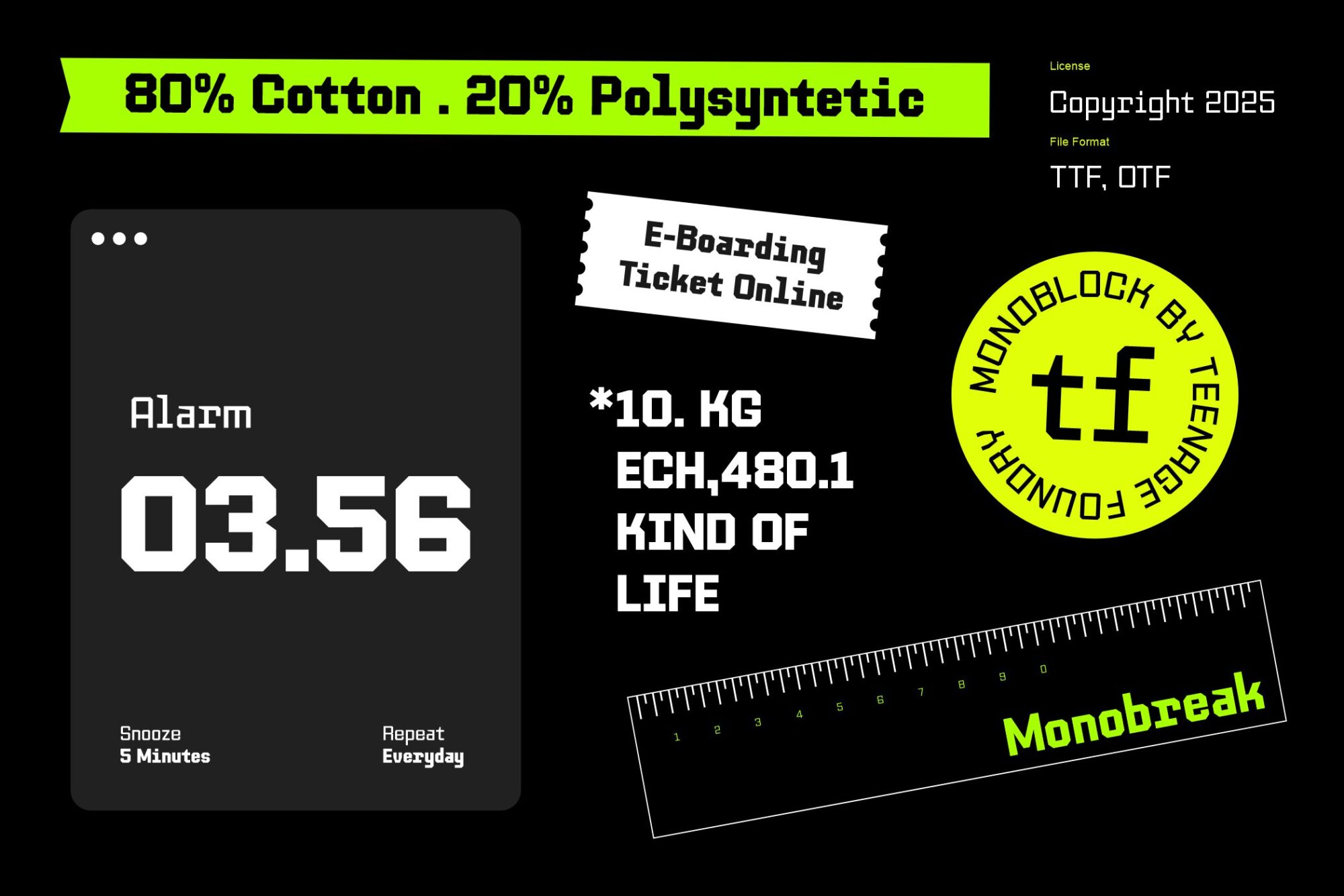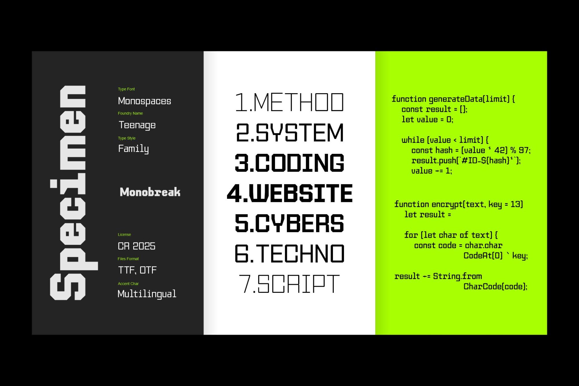 Monobreak is a modern geometric monospace font crafted with clean precision and refined balance. Each character is built with a perfect harmony of technical structure and contemporary style, making it ideal for designs that demand a bold, professional, and futuristic presence.